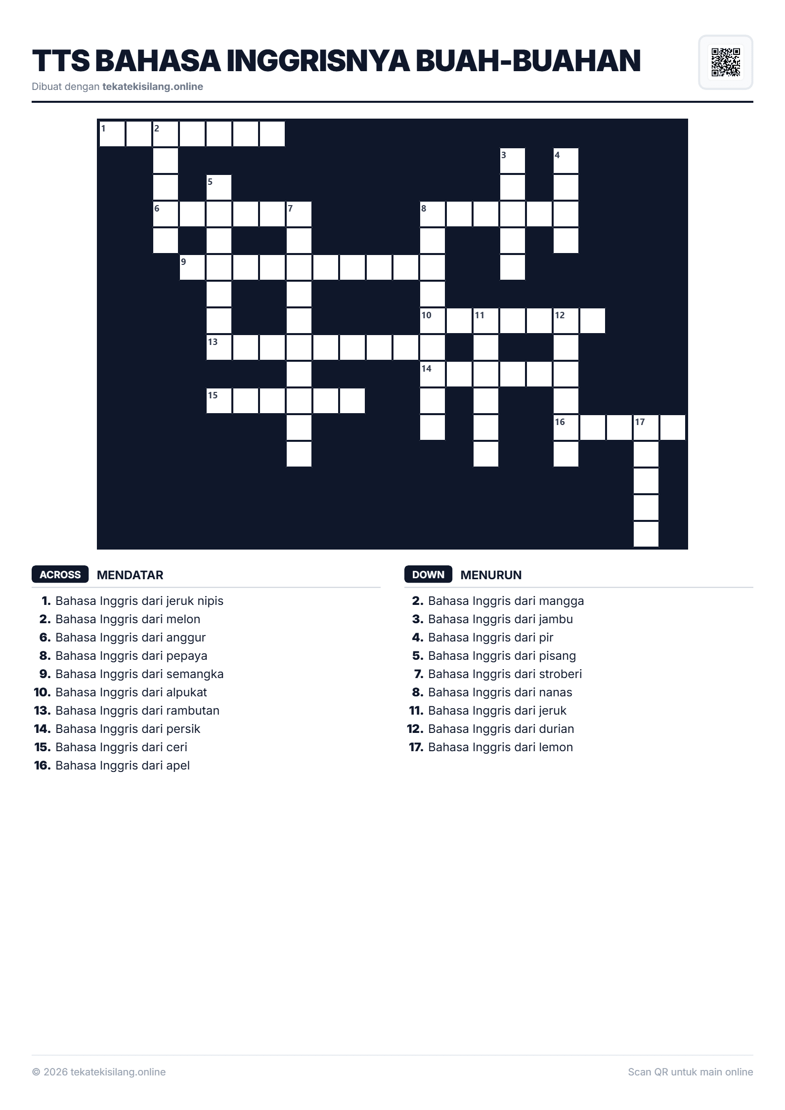 TTS Bahasa Inggrisnya Buah-buahan17/1/2026Bahasa1588 x 2246 pxVisual puzzle TTS Bahasa Inggrisnya Buah-buahan. Mainkan TTS online gratis sekarang!#TTS Bahasa Inggrisnya Buah-buahan#Bahasa#teka teki silang