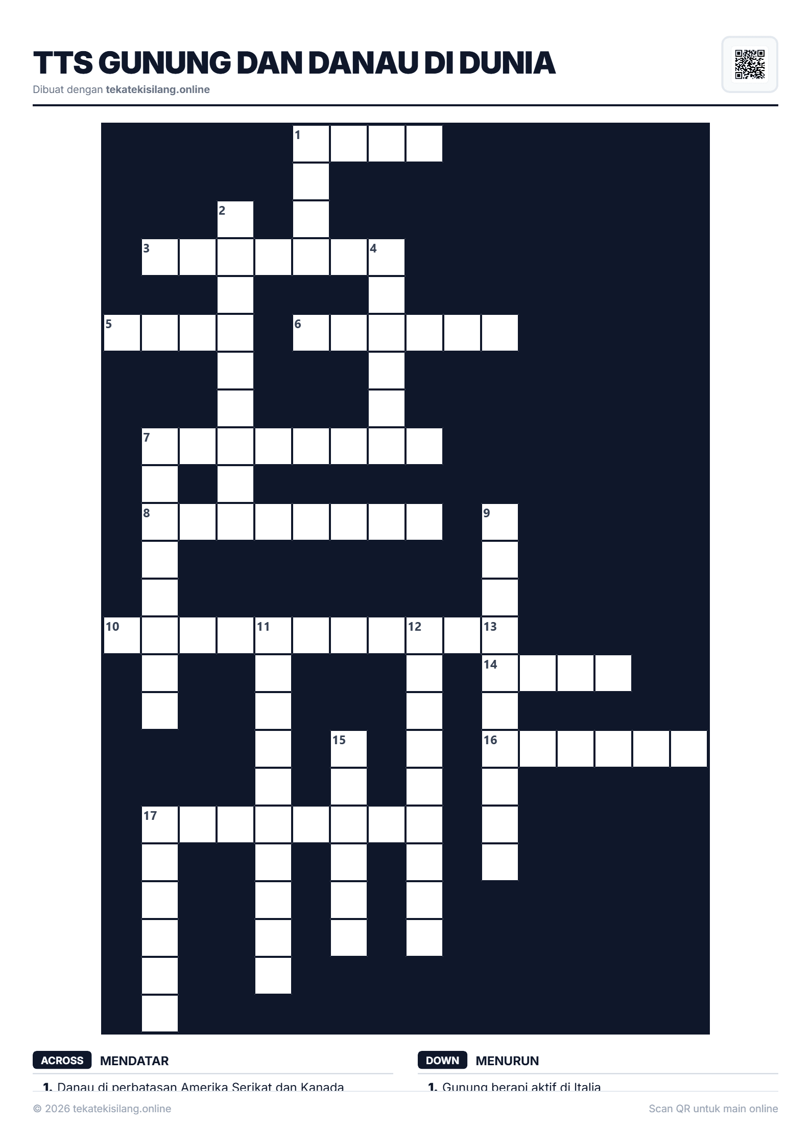 TTS Gunung dan danau di Dunia17/1/2026Geografi1588 x 2246 pxVisual puzzle TTS Gunung dan danau di Dunia. Mainkan TTS online gratis sekarang!#TTS Gunung dan danau di Dunia#Geografi#teka teki silang